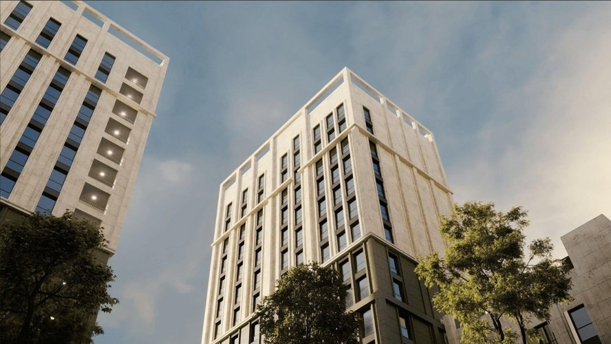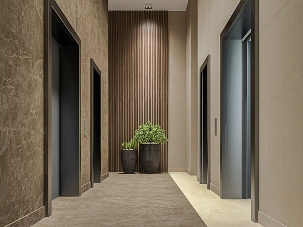 Величественные фасады из натурального травертина с латунными кассетами создают игру света и тени. Орнаментальное панно и декоративная арка символизируют связь классики с природой.