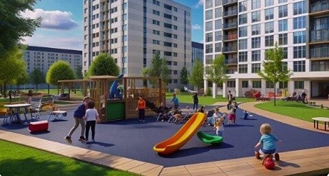 В жилом комплексе создана яркая и безопасная игровая зона для детей, где малыши смогут весело провести время на свежем воздухе.