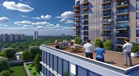 Жилой комплекс с видом на город: эксплуатируемая крыша для отдыха и наслаждения панорамным видом.